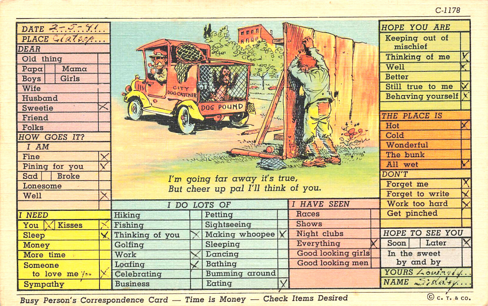 "I'm going far away it's true" . C. T., C. 1178 Linen, Linen Postcard.If you buy more than one item 'buy it now' Please use the 'add to basket' function as this will activate the combined shipping rate.For More Great Photographs, Trade Cards, Covers, postcards etc. Visit our Hip Store: popcornjohn.com