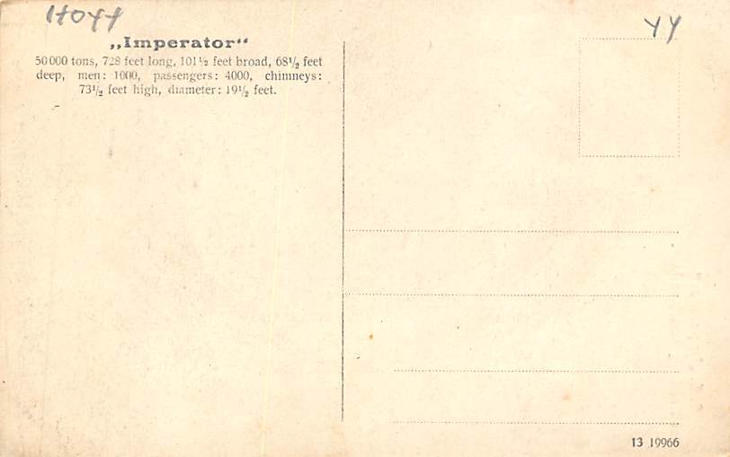 Imperator Hamburg-America Line Ship Postcard , Grade: 2 Size: Regular Size Postcard - approximately 3 1/2 inch x 5 1/2 inch (9 CM x 14 CM) Grading Scale: Grade 1 = Perfect corners Grade 2 = Very Minimal corner ... Read More