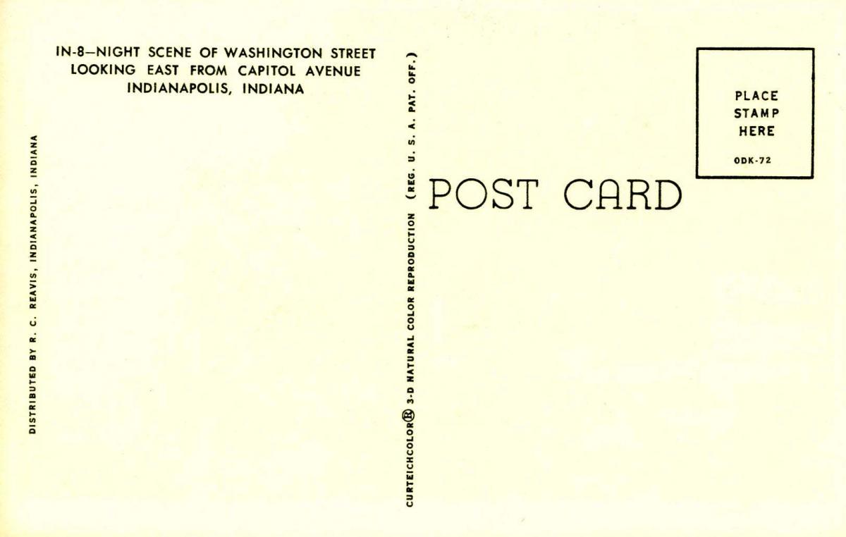 IN - Indianapolis. Washington Street at night Grading of Postcards MINT (M): Perfect condition, no apparent blemishes, flaws, postally unused, may have some writing on back. NEAR MINT (NM): Like new, image is unco ... Read More