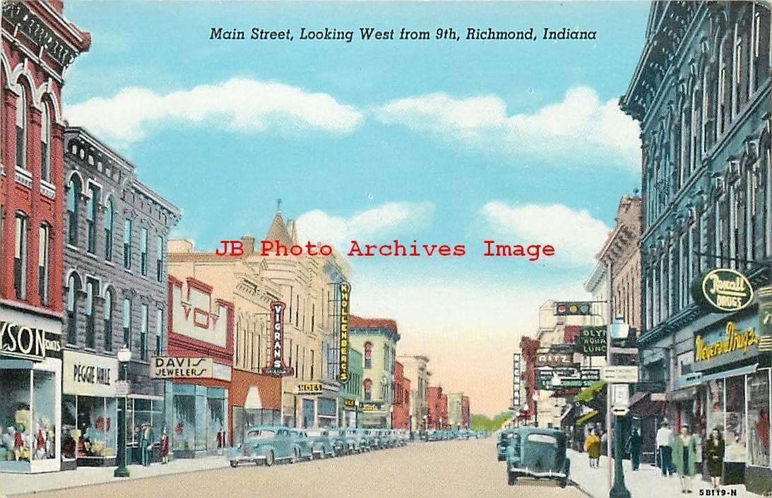 In, richmond, indiana, main street, looking west, business area, teich no 5b119n Product Photo Click Image for Larger Preview Product Information This is a nice vintage printed linen postcard showing a scene of Ma ... Read More