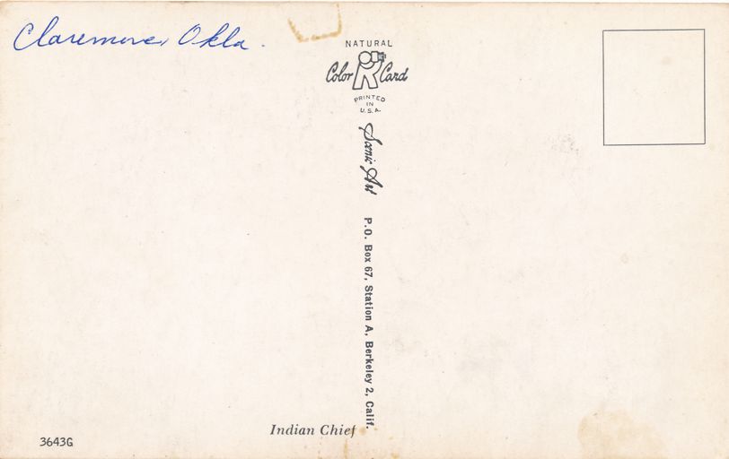 Indian Chief - Western USA - Oklahoma. Standard sized chrome card. (Probably purchased in Claremore, Oklahoma.). Good to very good condition.