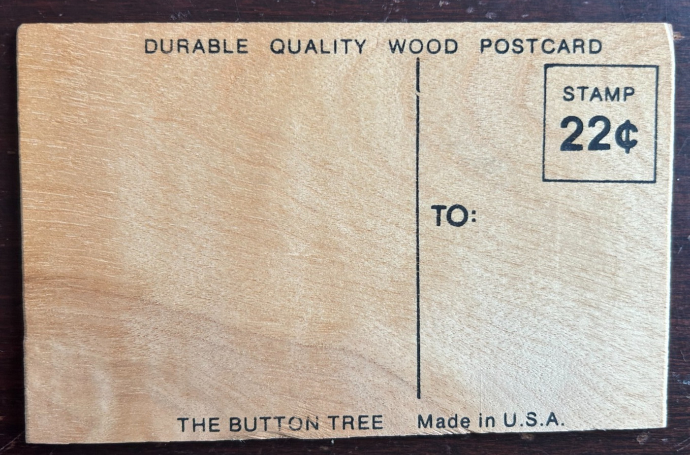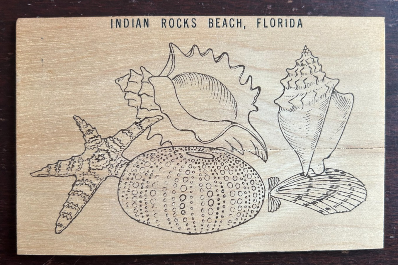 This unique vintage postcard features a detailed line drawing of various seashells and a starfish, titled 'Indian Rocks Beach, Florida.' Unlike traditional paper postcards, this piece is crafted from wood, giving it a distinctive tactile and visual appeal. The natural wood grain complements the intricate black ink illustration, making it a charming collectible for beach lovers and postcard enthusiasts alike.Indian Rocks Beach is a well-known coastal destination in Florida, celebrated for its beautiful shores and marine life. This postcard captures the essence of the area's natural treasures, perfect for collectors interested in nautical themes or Florida memorabilia. Its unposted condition and original production add to its collectible value, highlighting a unique approach to postcard design beyond standard linen or real photo types.