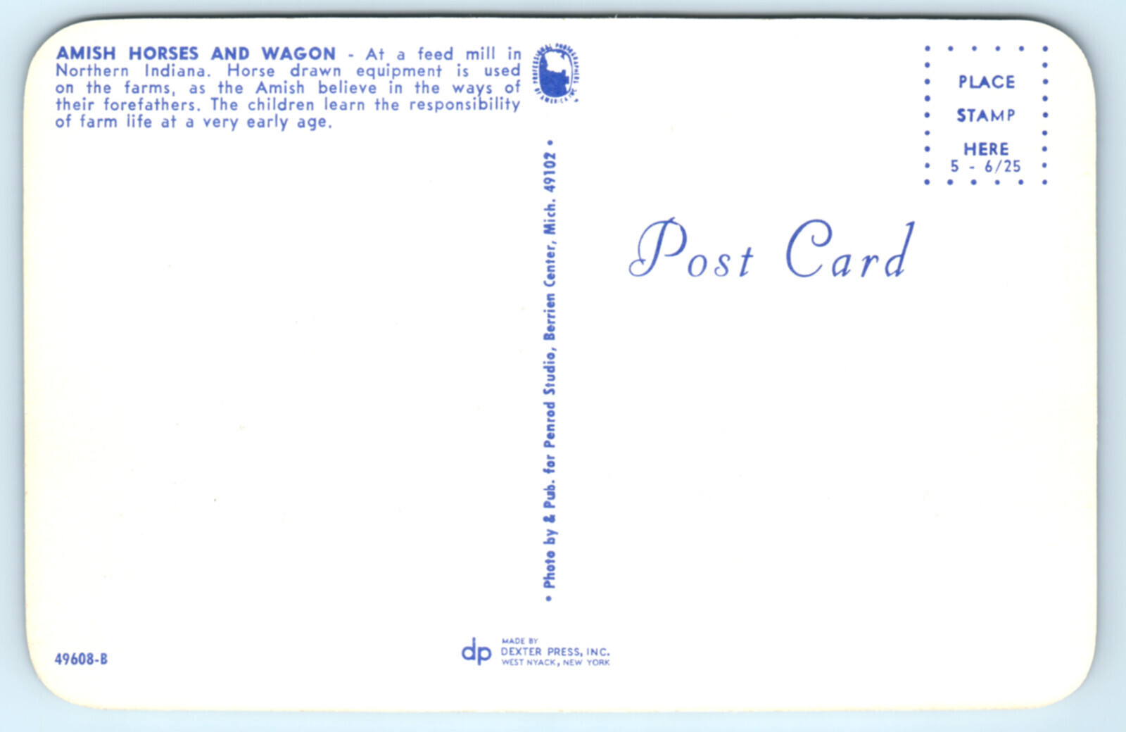 3.5 X 5.5 inch printed postcard. 1st photo is zoomed in to show detail. Some wear from use, age storage and transport. Some edge wear and corner bumping. See photos they are a key part of the item and condition description. Please ask us any questions you may have on this item prior to bidding or purchase we will get back to you asap. Indiana Feed Mill Boy Wagon Horses Amish Advertising Signs Postcard