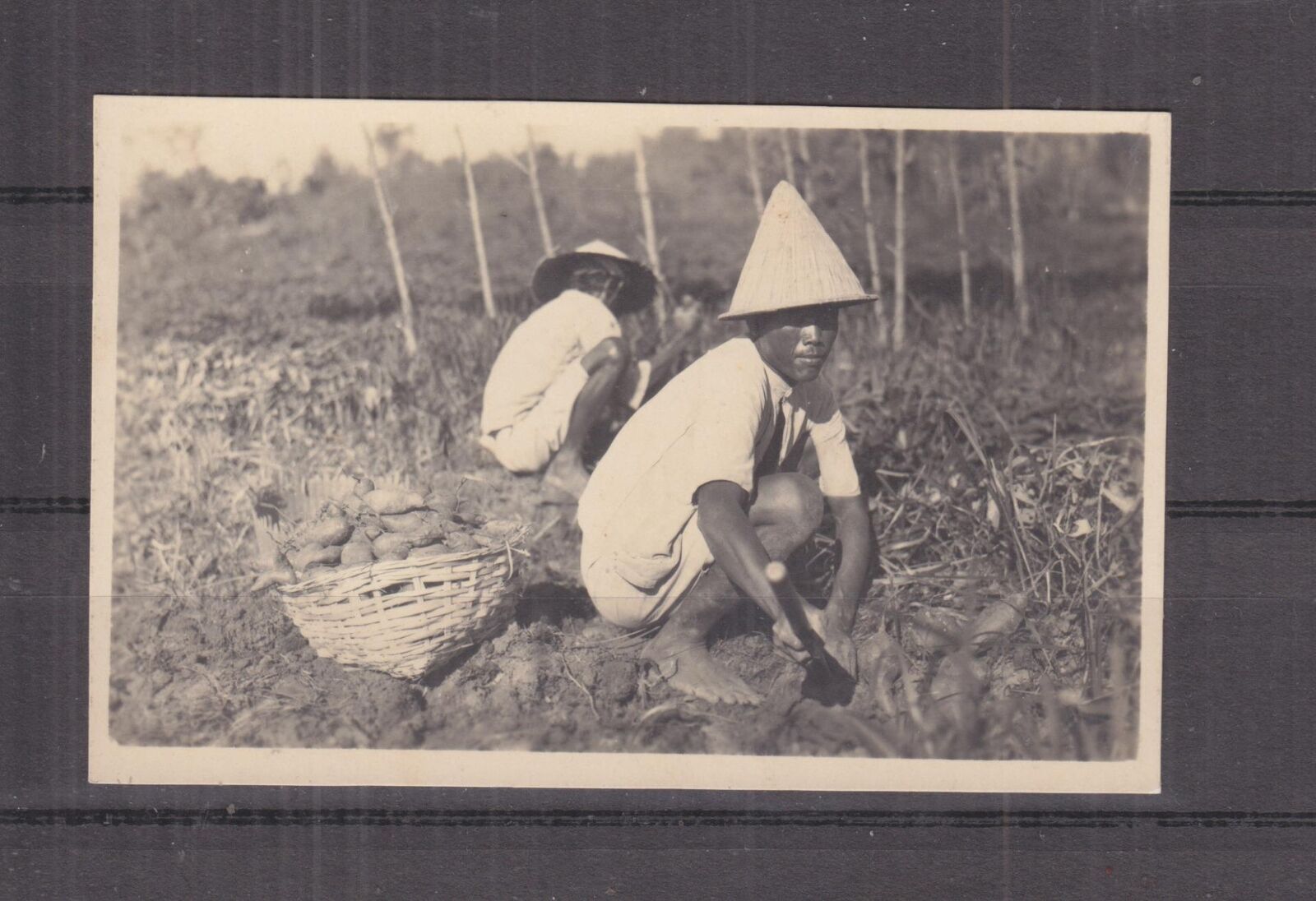 INDONESIA, MEN DIGGING FOR CASSAVA, c1930 real photo ppc, unused.