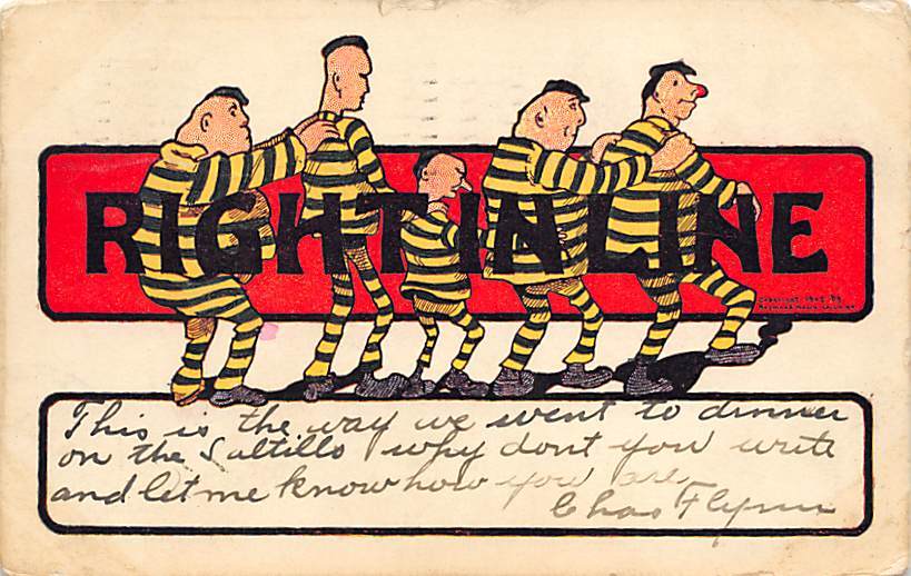 Inmates in line Reymond Howe 1907, Grade: 3, , Size: Regular Size Postcard - approximately 3 1/2 inch x 5 1/2 inch (9 CM x 14 CM) Grading Scale: Grade 1 = Perfect corners Grade 2 = Very Minimal corner wear, no ... Read More