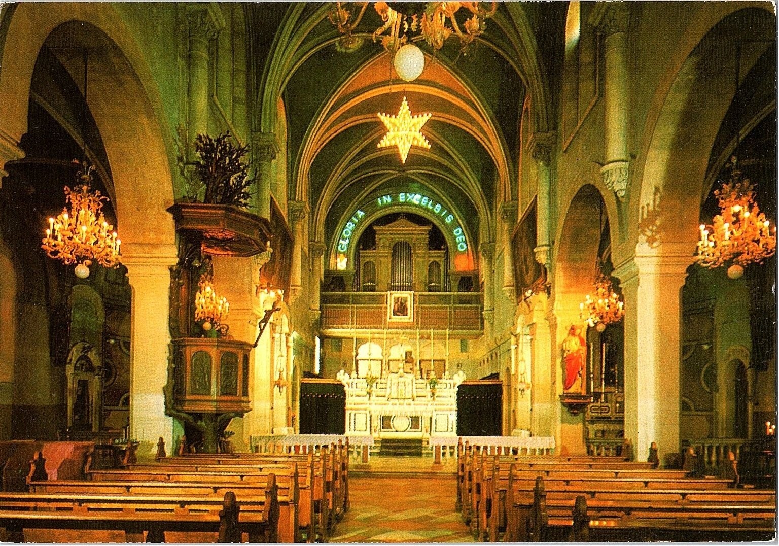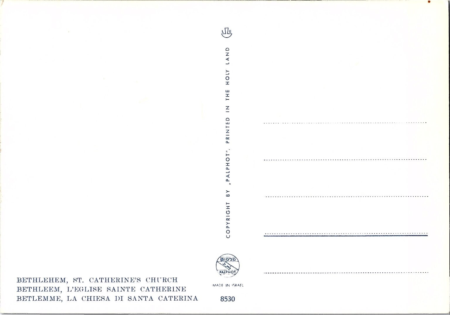 This vintage postcard showcases the stunning interior of St. Catherine's Church in Bethlehem, a historic site adjacent to the Church of the Nativity. Featuring ornate chandeliers, elegant arches, and a glowing star with the inscription "Gloria in Excelsis Deo," the image captures a serene and sacred atmosphere. The postcard is a photochrome print, a vibrant lithographic process popular from 1939 onward, highlighting the rich warm tones and intricate architectural details.Printed by Palphot in Israel, this collectible postcard dates from the 1960s and is part of a licensed reprint series. The back includes multilingual captions identifying the church in English, French, and Italian, emphasizing its significance as a religious and cultural landmark. Ideal for collectors of Holy Land memorabilia or vintage travel postcards, this piece offers a glimpse into mid-20th century religious sites and postcard production techniques.