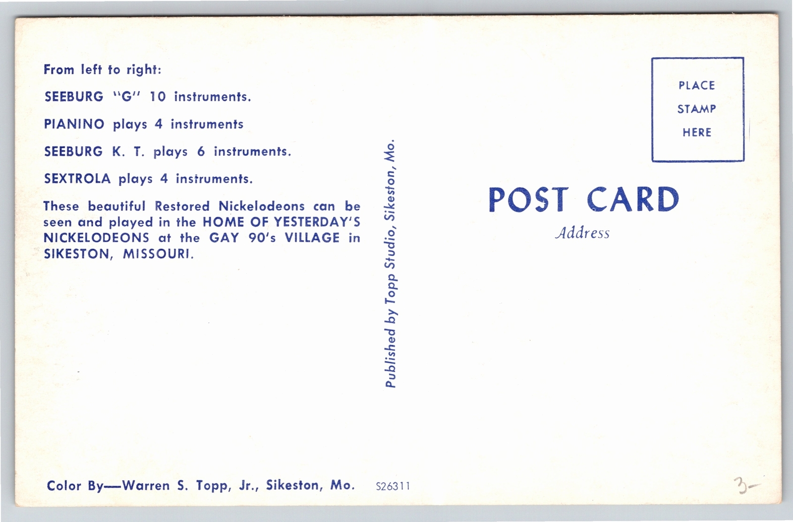 Interior~4 Instruments Home of Yesterdays Nickolodeons~Vintage Postcard