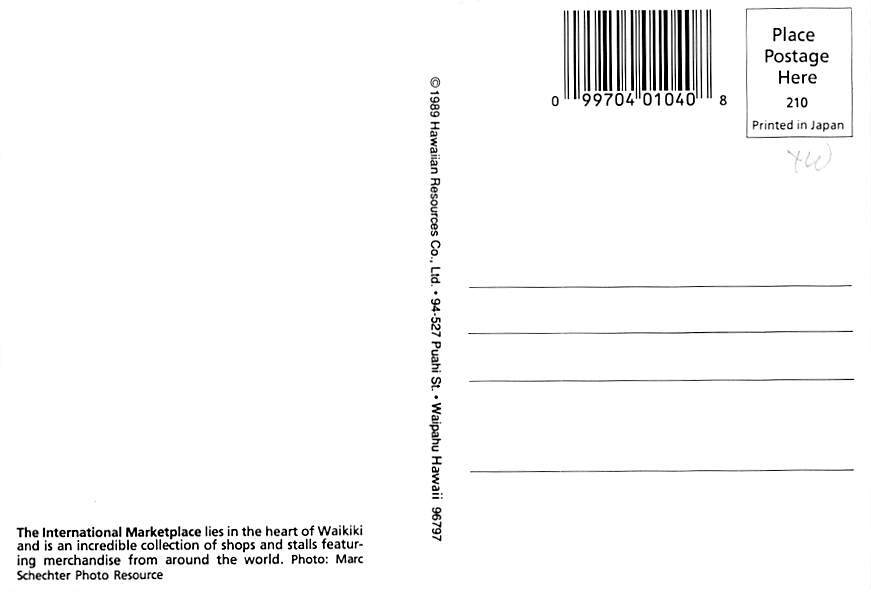 International Market Place, Hawaii Postcard - View Images Grade: 1 Size: C - Continental Size Postcard - approximately 4 inch X 6 inch (15 CM X 10.5 CM) Grading Scale: Grade 1 = Perfect corners Grade 2 = Very M ... Read More