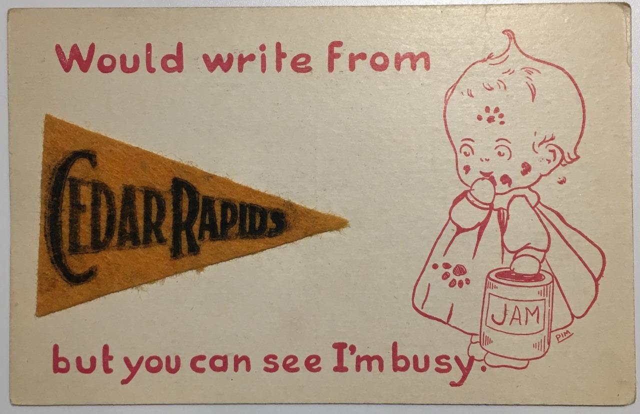 Iowa Greetings CEDAR RAPIDS Felt Pennant Comic Pim Art c1910s Vintage Postcard