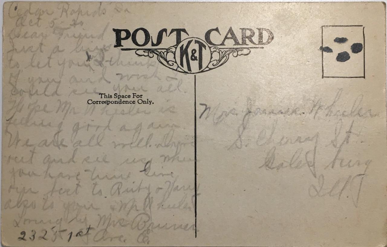 Very Good, tiny crease on top edge near right, slight corner & edge wear. *Scroll Down to see an image of the back of the postcard. Iowa Greetings CEDAR RAPIDS Felt Pennant Comic Pim Art c1910s Vintage Postcard Iowa Greetings CEDAR RAPIDS Felt Pennant Comic Pim Art c1910s Vintage Postcard Click images to enlarge Description Vintage Postcard. There is a flat rate of $1.00 to ship anywhere within the U. S. Multiple items will have a combined shipping rate of only $1.00. International - $1.50. Please check our other items in our Hip store: Visit My Hip Store. Please feel free to contact me with any questions you may have. All cards sold are vintage, no reproductions. Get images thatmake Supersized seem small.Showcase your items with Auctiva'sListing Templates!Attention Sellers - Get TemplatesImage Hosting, Scheduling at Auctiva.com.Track Page Views WithAuctiva's FREE Counter