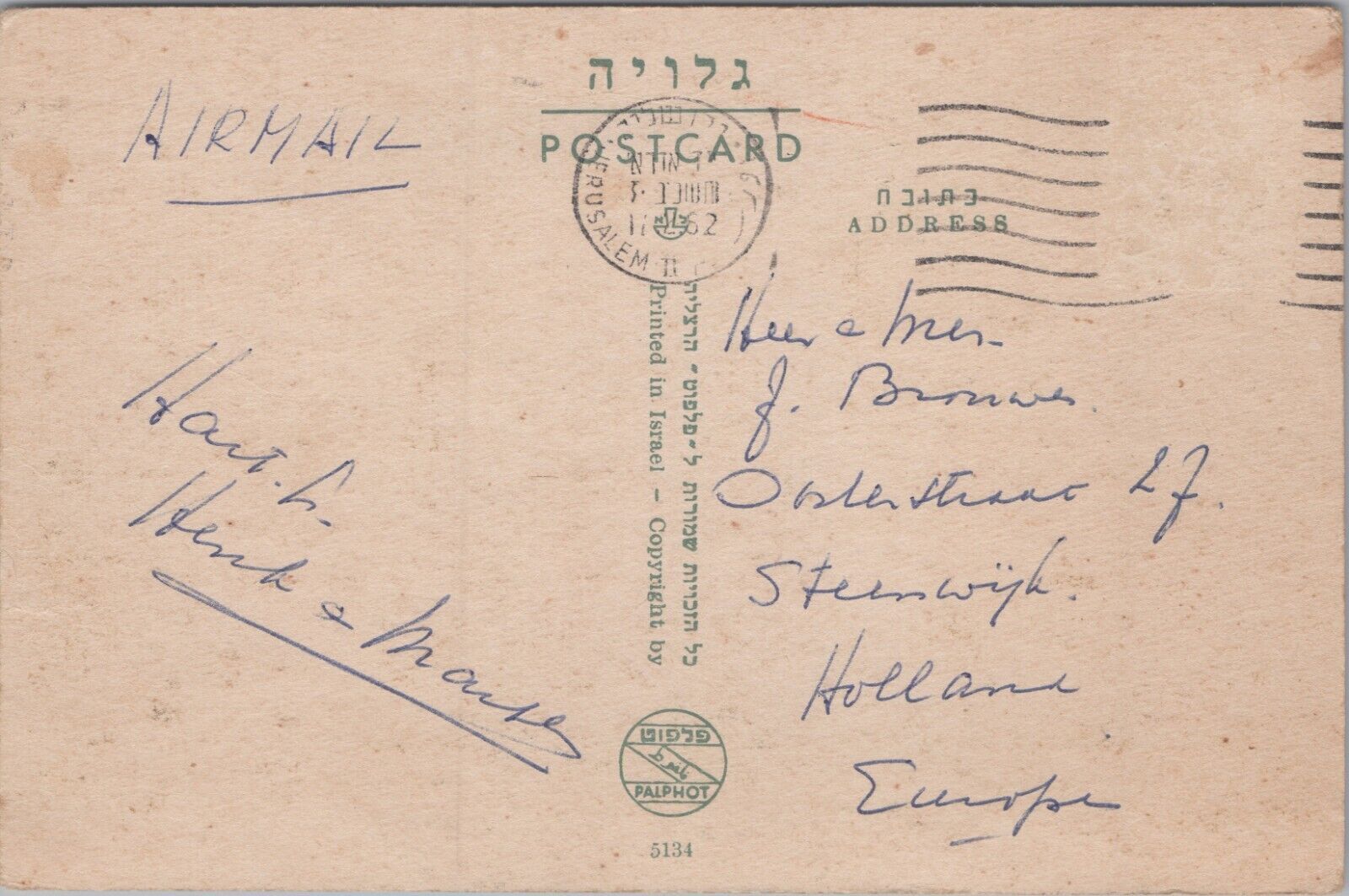 Capture a piece of the Holy Land with the Israel Jerusalem Partial View Postcard C346. This standard-sized lithograph print offers a glimpse of the captivating city of Jerusalem, one of the most significant sites in the Middle East. Perfect for collectors or those who cherish memories of iconic cities and towns, this postcard is a cherished snapshot of Israel's rich heritage. The postcard is a unique acquisition for anyone interested in Middle Eastern culture or historical geography. Made in Israel, it is an original photochrome print from the era of 1939 to now. It is a single unit offering, not part of a set, and has been posted, allowing you to add it directly to your collection or send it as a thoughtful memento.Look close at the pictures for the quality of the postcards and use the Hip zoom to examine the front and back. Lines are from the scanner and are not on the postcardIf you Buy More items please wait before you pay! I will sent you an invoice to combine shipping discount!!!1 postcard Shipping Worldwide $2.00 and after that 50 cents extra for each card. So for example: You buy 3 cards shipping will cost you $2.00 plus $1.00 is $3.00 dollars.I will Ship in a plastic Postcard Sleeve for protection.