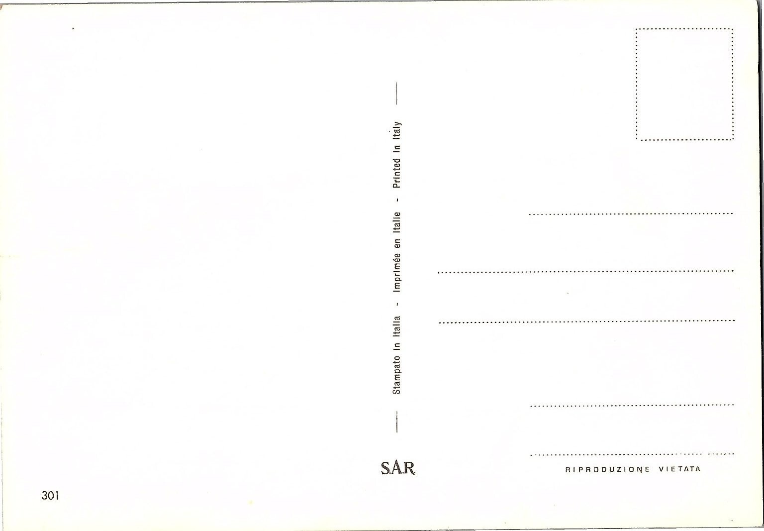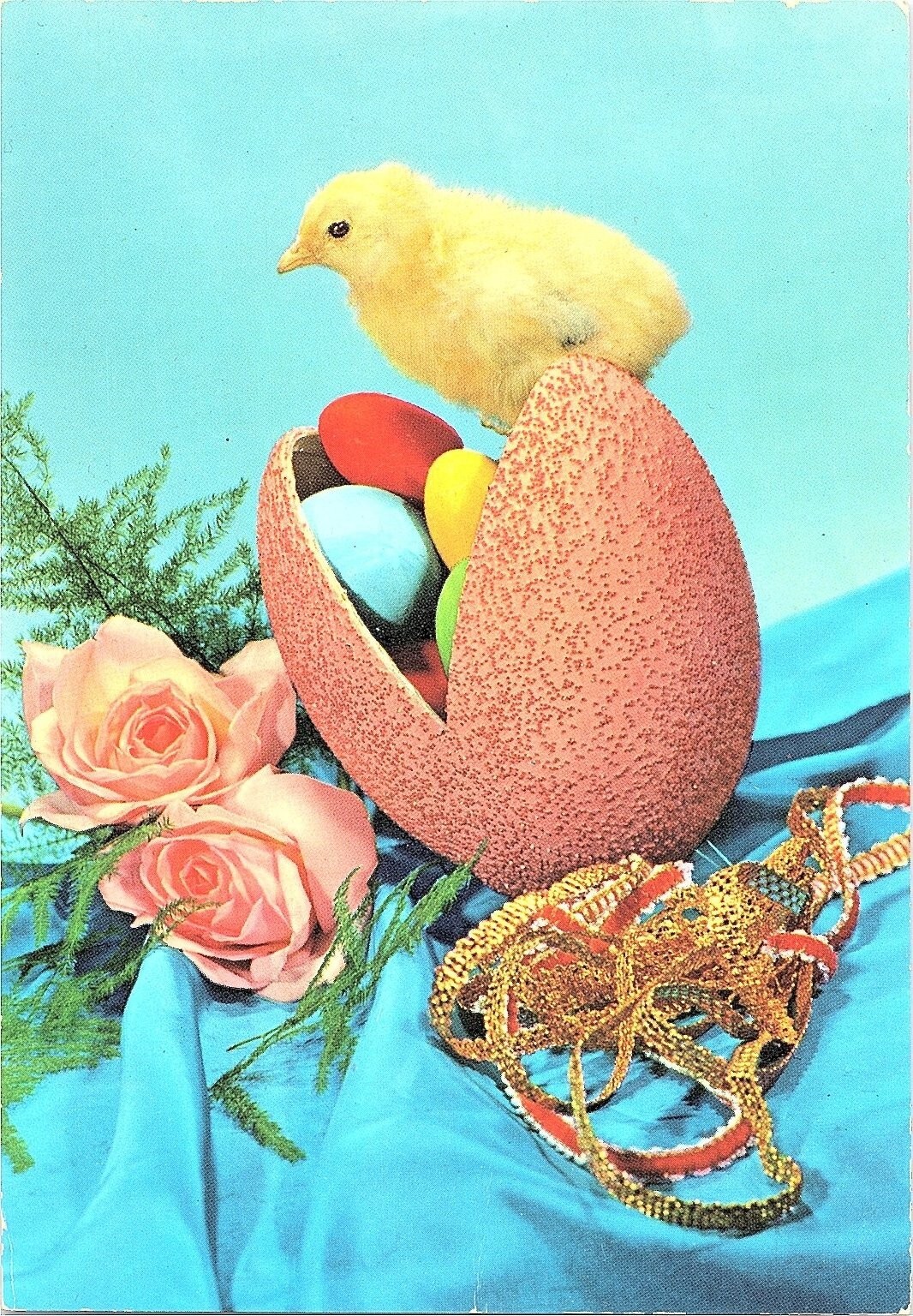 This charming vintage postcard from the 1960s features a colorful Easter theme with a fluffy yellow chick peeking out from behind a textured, partially opened pink egg filled with brightly colored eggs. The background includes delicate pink roses and green foliage against a vibrant blue cloth backdrop, creating a festive and cheerful composition. Printed in Italy, this lithograph postcard showcases the popular Photochrome style from the mid-20th century, known for its vivid colors and crisp details.The postcard measures a standard Continental size of 6 x 4 inches and is unposted, preserving its original printed surface and design. The back is marked with "Stampato In Italia - Imprimée en Italie - Printed In Italy" and includes the publisher mark "S.A.R." along with the number 301. This piece captures the nostalgic charm of vintage Easter greetings, making it a delightful collectible for postcard enthusiasts, vintage holiday memorabilia collectors, or those who appreciate mid-century European printed ephemera.