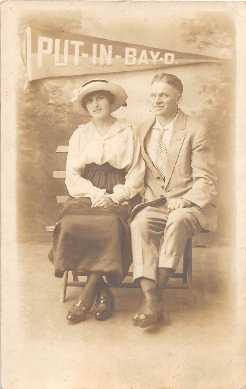 J56/ Put-In-Bay Ohio RPPC Pennant Postcard c1910 Studio Bench 322