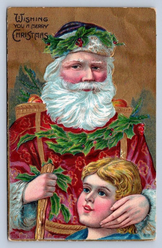 J87/ Santa Claus Christmas Postcard c1910 Holly Child WOW! 513