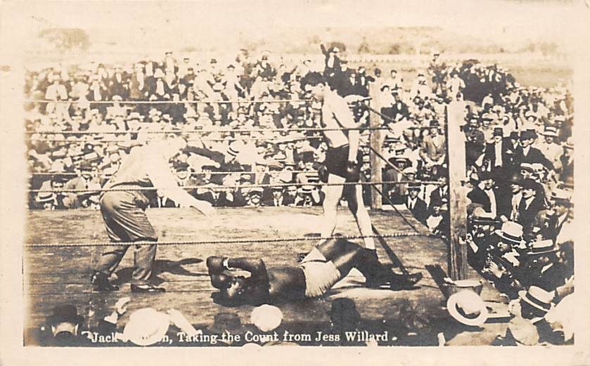Jack Johnson Taking the count from Jess Willard, advertising on back Boxing U...