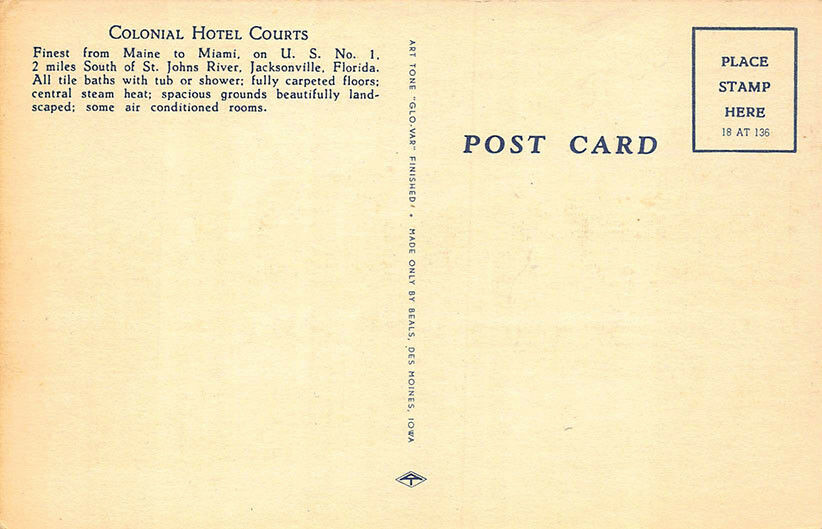 Jacksonville FL Colonial Hotel Courts, linen postcard.