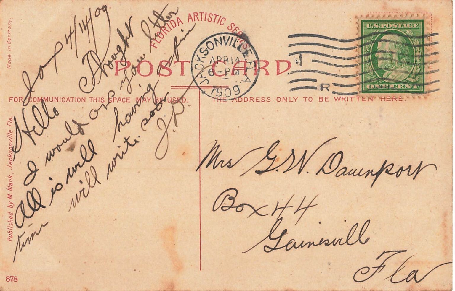 This vintage postcard features a captivating view of the historic Masonic Temple in Jacksonville, Florida, as it appeared in the early 20th century. The intricate illustration showcases the grand architectural details of the multi-story building, a significant landmark in the city's history. The scene is brought to life with finely dressed individuals, including women with parasols and children, alongside a horse-drawn carriage, offering a vivid glimpse into daily life of the era.Published by M. Mark of Jacksonville as part of the "Florida Artistic Series," this postcard was made in Germany, renowned for its high-quality printing techniques of the period. The reverse side bears a clear Jacksonville, Florida postmark dated April 8, 1909, confirming its authentic early 20th-century origin. This collectible piece offers a unique historical perspective on Jacksonville's architectural heritage and social landscape.