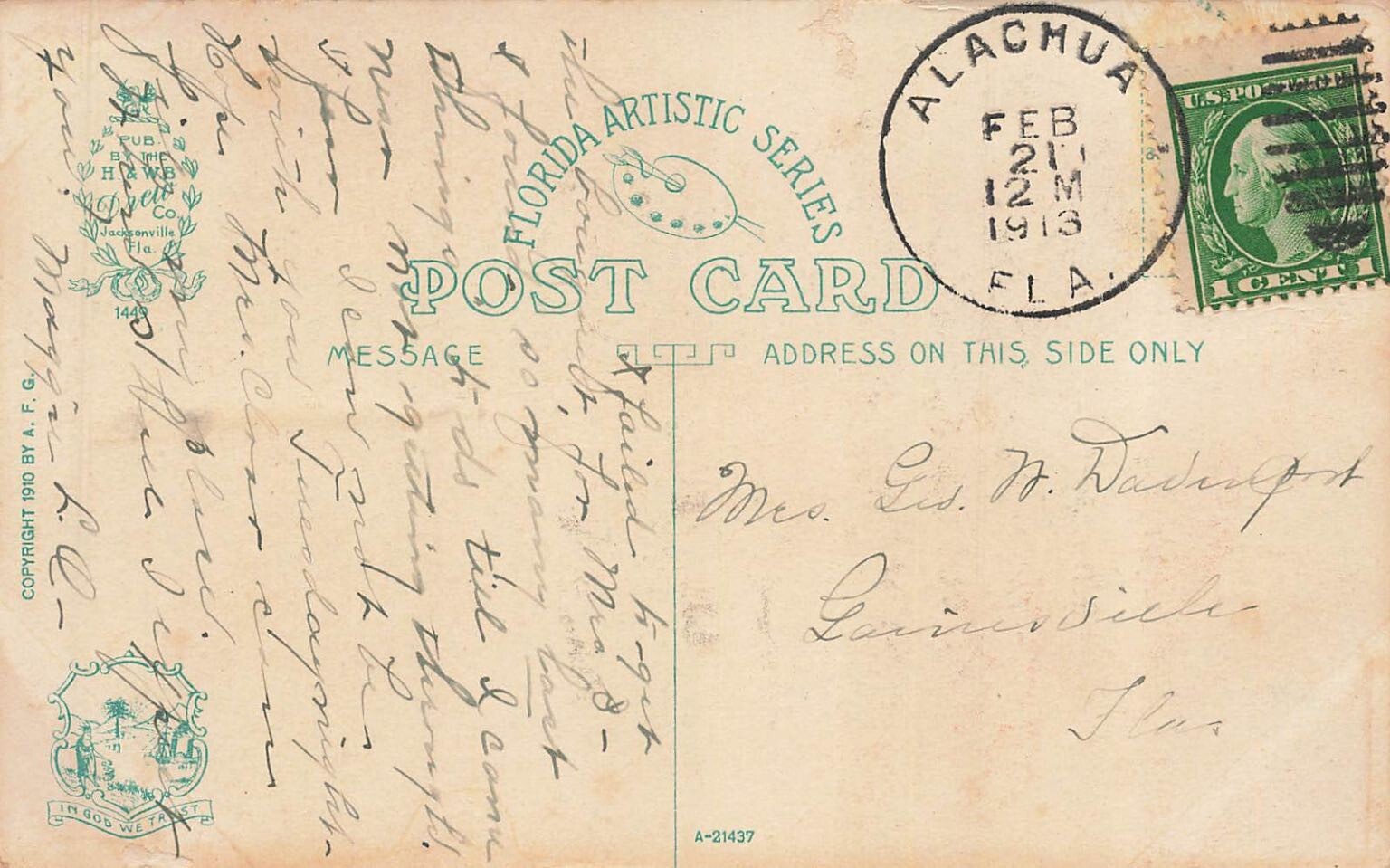 Discover a captivating piece of early 20th-century Florida with this vintage postcard showcasing the "Skyscraper District" of Jacksonville. The front features a vibrant, hand-tinted cityscape, capturing the bustling urban environment with its prominent tall buildings, active street scenes, and a classic trolley car, all under a dynamic sky. This view provides a fascinating glimpse into Jacksonville's architectural development and urban landscape during a period of significant growth.This collectible postcard, part of the "Florida Artistic Series," was published by H. & W. B. Co. of Jacksonville, Florida, and is copyrighted 1910 by A. F. G., indicating its historical significance. The divided back bears a clear Alachua, Florida postmark from February 21, 1913, complete with a 1-cent George Washington stamp. The handwritten message and address to Mrs. Geo. M. Wadington in Gainesville, Florida, add a personal touch and historical context, connecting the card to a specific moment in time.