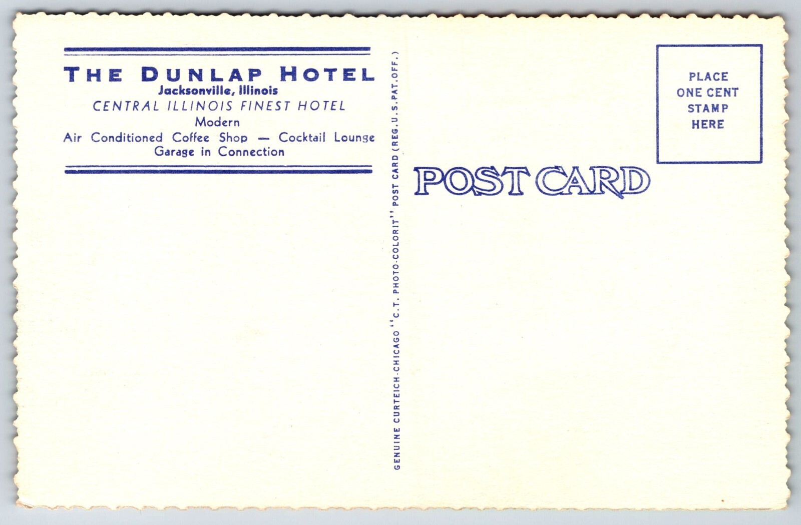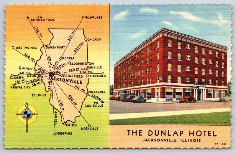 Jacksonville Illinois~Dunlap Hotel & State Map~Compass~Linen Postcard