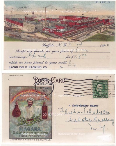 Jacob Dold Packing Co. Buffalo Ny Description: Postal Usage: PM 1920 Condition: Excellent Type: Excellent Note: Front & Back Pictured County: Erie Co. > Buffalo