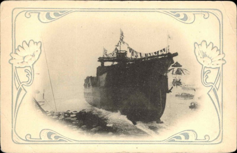 Japanese Steamship - Ship Launching? Floral Border c1910 Postcard