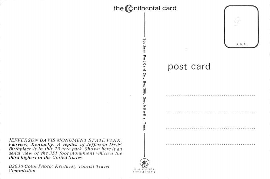 Jefferson Davis Monument State Park - Fairview, Kentucky Grade: 1 Category: Continental Size Postcard, Approx 4 in x 6 in (10 cm x 15.25 cm) Product Size: Continental size: 4X6 inches (10.5 cm x 15 cm) Grading ... Read More