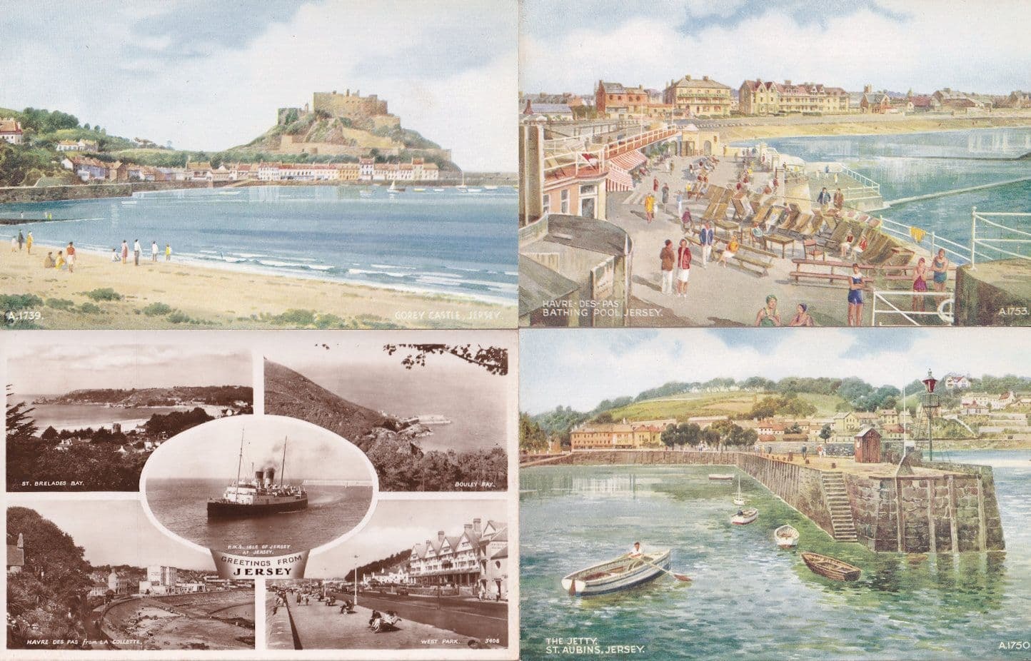 ts122 Four old postcards from Jersey - two of the local Bathing Pool - one of a water aerial view and one of a general real photo selection of vintage views - the cards are all unused in outstanding condition and these have great boats and nautical swimming views from Jersey of the era