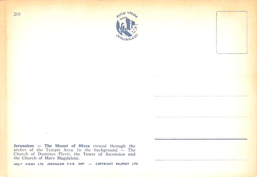 Jerusalem - The Mount of Olives Grade: 1 Category: Continental Size Postcard, Approx 4 in x 6 in (10 cm x 15.25 cm) Product Size: Continental size: 4X6 inches (10.5 cm x 15 cm) Grading Scale: Grade 1 = Perfect ... Read More