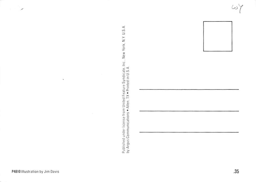 Jim Davis - Garfield Grade: 1 Category: Continental Size Postcard, Approx 4 in x 6 in (10 cm x 15.25 cm) Product Size: Continental size: 4X6 inches (10.5 cm x 15 cm) Grading Scale: Grade 1 = Perfect corners Gra ... Read More