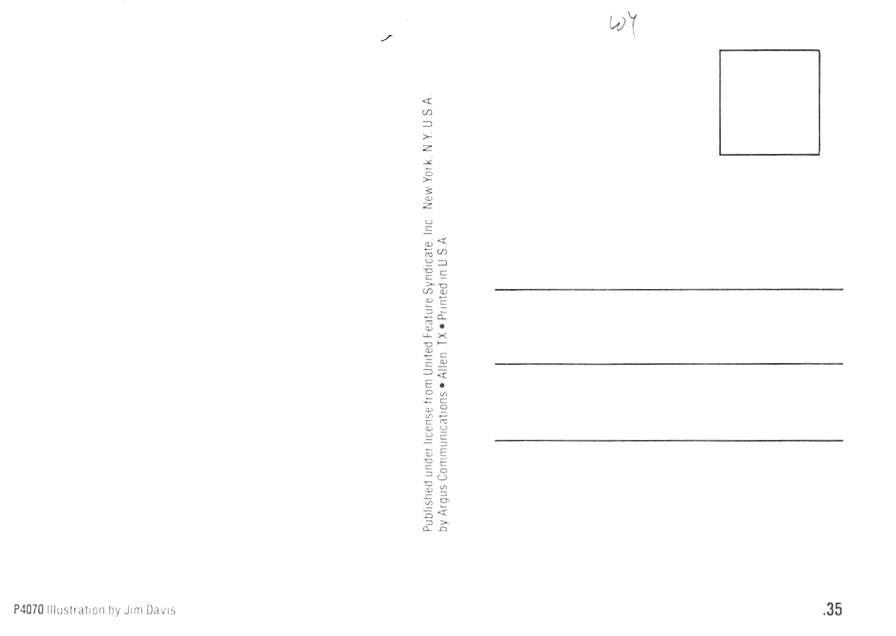 Jim Davis - Garfield Grade: 1 Category: Continental Size Postcard, Approx 4 in x 6 in (10 cm x 15.25 cm) Product Size: Continental size: 4X6 inches (10.5 cm x 15 cm) Grading Scale: Grade 1 = Perfect corners Gra ... Read More