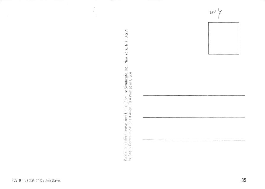 Jim Davis - Garfield Grade: 1 Category: Continental Size Postcard, Approx 4 in x 6 in (10 cm x 15.25 cm) Product Size: Continental size: 4X6 inches (10.5 cm x 15 cm) Grading Scale: Grade 1 = Perfect corners Gra ... Read More