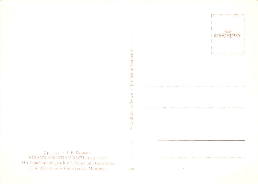 Johann Sebastian Bach - Grade: 1 Category: Continental Size Postcard, Approx 4 in x 6 in (10 cm x 15.25 cm) Product Size: Continental size: 4X6 inches (10.5 cm x 15 cm) Grading Scale: Grade 1 = Perfect corners ... Read More