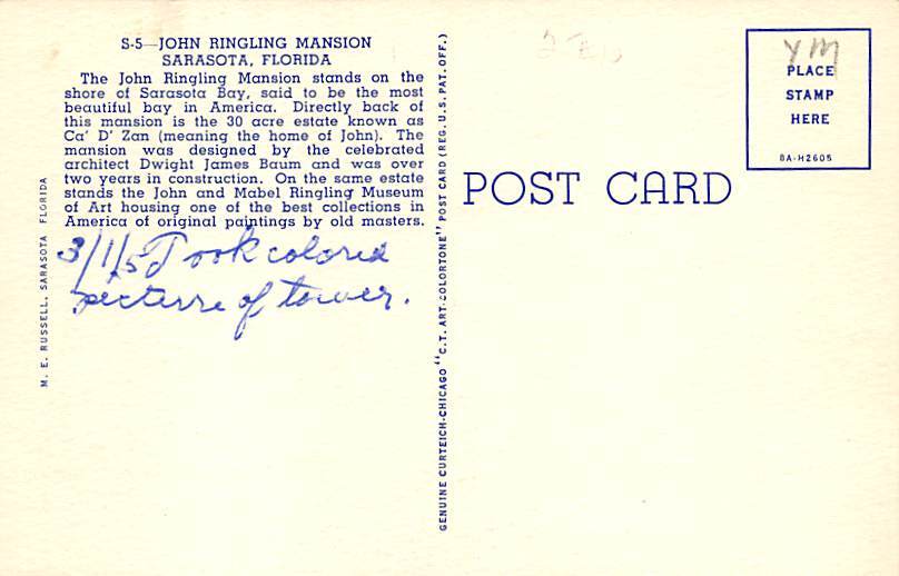 John Ringling Mansion Between Bradenton and Sarasota Sarasota FL Postcard - Writing on Back