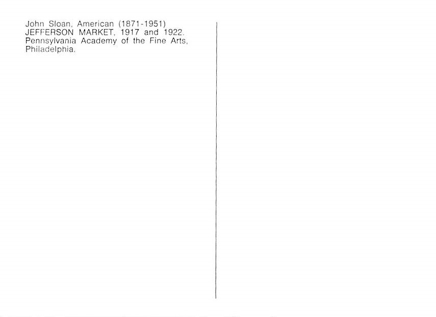 John Sloan - Jefferson market Grade: 1 Category: Continental Size Postcard, Approx 4 in x 6 in (10 cm x 15.25 cm) Product Size: Continental size: 4X6 inches (10.5 cm x 15 cm) Grading Scale: Grade 1 = Perfect c ... Read More
