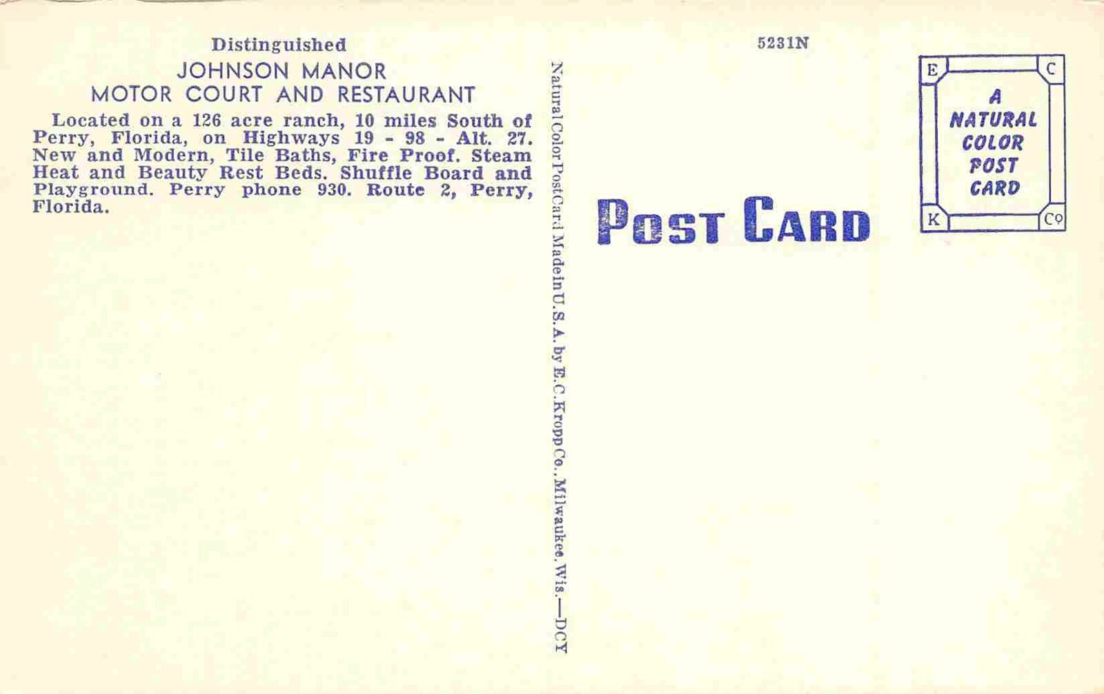Johnson Manor Motel Perry Florida linen postcard