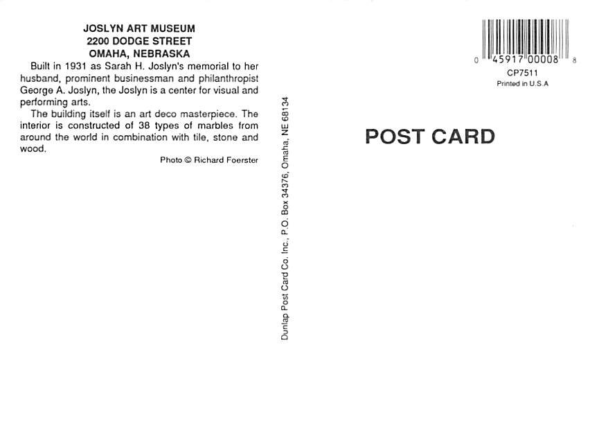 Joslyn Art Museum - Omaha, Nebraska Grade: 1 Category: Continental Size Postcard, Approx 4 in x 6 in (10 cm x 15.25 cm) Product Size: Continental size: 4X6 inches (10.5 cm x 15 cm) Grading Scale: Grade 1 = Per ... Read More