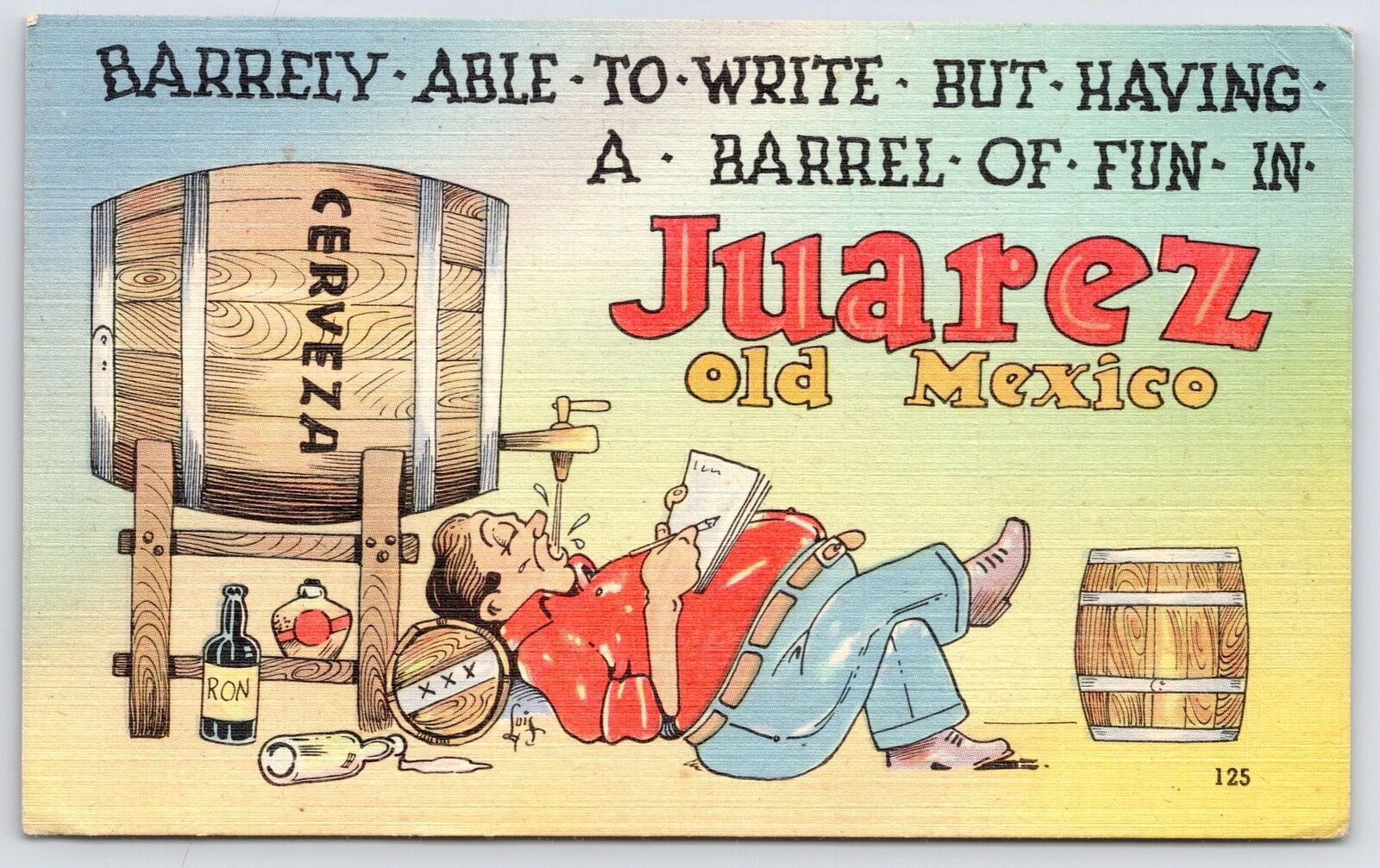 Juarez MX Comic Pun~Drunk Gets Beer-Cerveza From Beer Barrel~Can Barrely Write