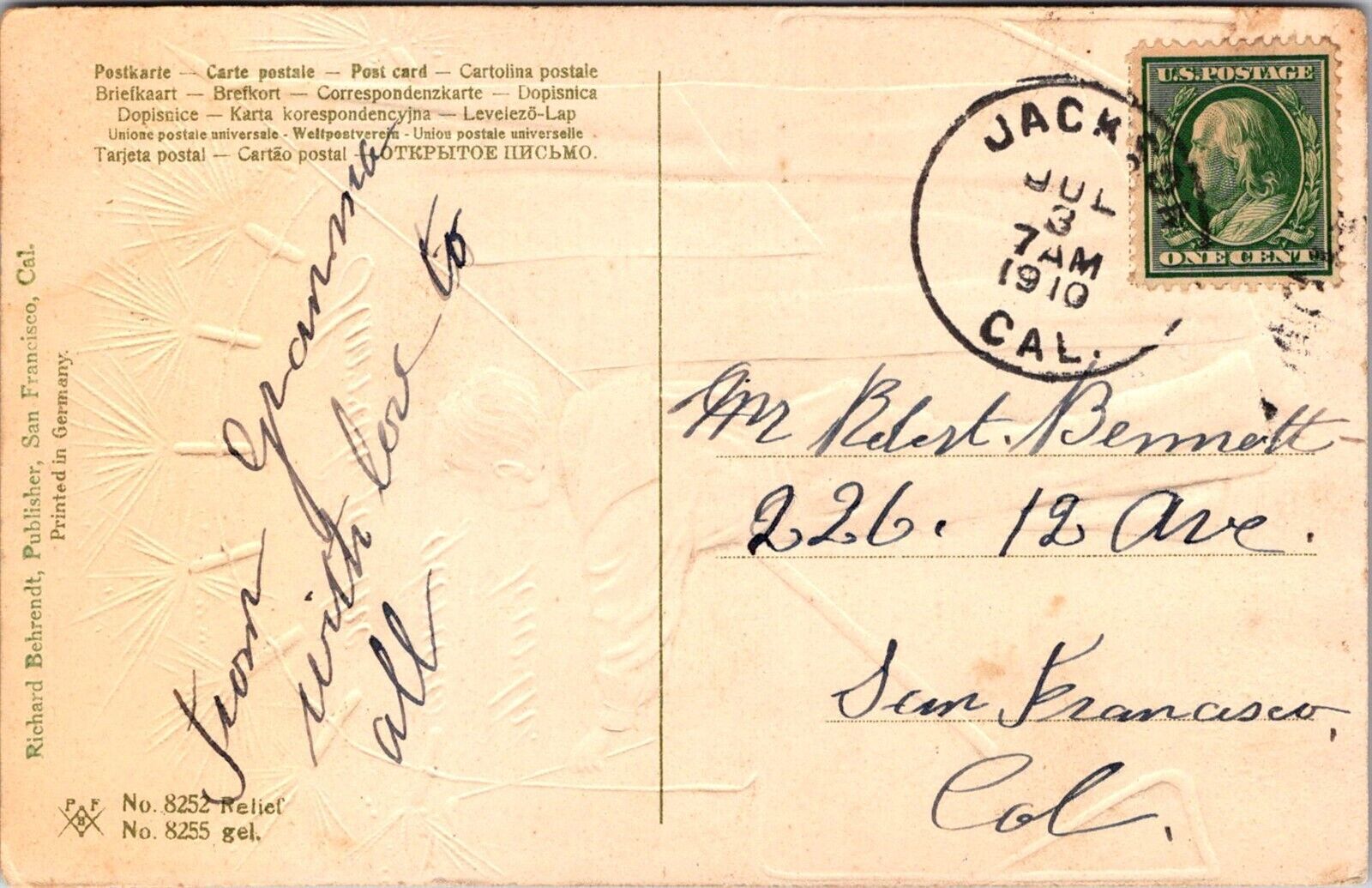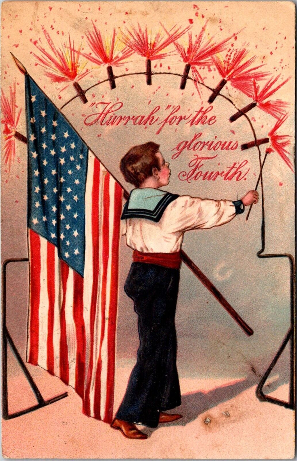 July 4 Boy With Flag Lights Fireworks Fire Crackers Embossed c1910 Postcard T71