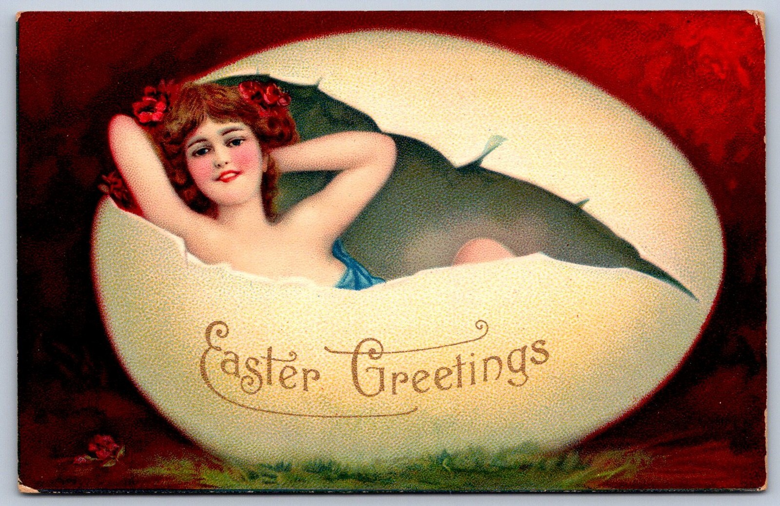K26/ Easter Postcard Holiday Greetings c1910 Woman Risque Egg 182