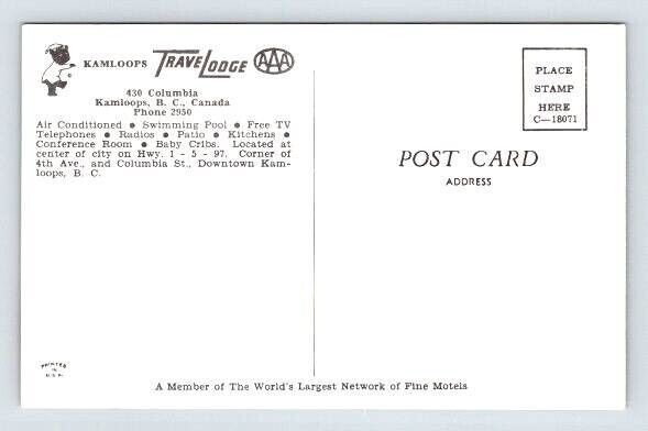 Kamloops B.C. Canada Travel Lodge Postcard- SKU: O-1054***Condition: see scans - Good --- Please review images for condition. Vintage postcards often have corner bumps and edge wear.We also offer combined shipping if combined shipping invoice request is made prior to payment. Invoice will be sent upon request.