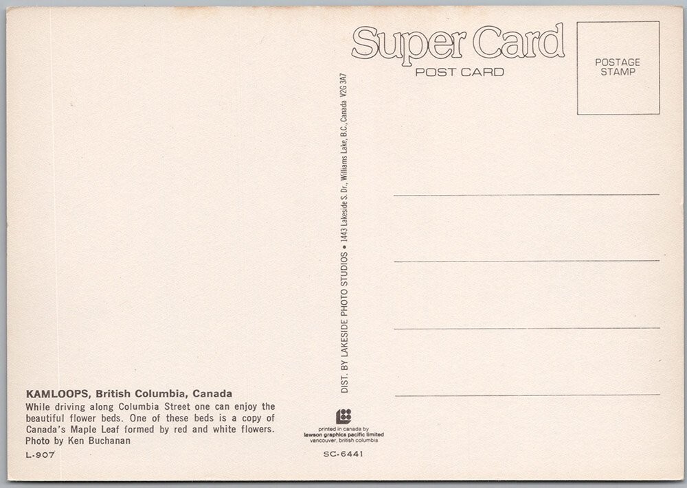 This vintage postcard showcases a vibrant floral display shaped like Canada's iconic Maple Leaf, located along Columbia Street in Kamloops, British Columbia. The colorful flower bed features red and white blooms meticulously arranged to represent the Canadian flag, offering a unique and charming glimpse into Canadian horticultural artistry and patriotism. Printed as a lithograph by Lawson Graphics Pacific Limited in Vancouver, British Columbia, this postcard is part of the Super Card series distributed by Lakeside Photo Studios. The card measures a continental size of 6 x 4 inches, making it an ideal collectible for enthusiasts of Canadian landscapes and vintage postcards. The back includes a brief description of the scene and the photographer credit to Ken Buchanan, adding provenance to this delightful piece. Perfect for collectors interested in Canadian memorabilia, floral art, or mid-20th century postcards, this item captures a serene moment in Kamloops with historical and regional significance. It is an original printed lithograph postcard, unposted, suitable for display or sending to friends and family as a nostalgic reminder of Canada's natural beauty and cultural pride.Please zoom into and look closely at the front and back photos to view condition and feel free to send me a message if you have any questions. Thanks kindly for viewing, D