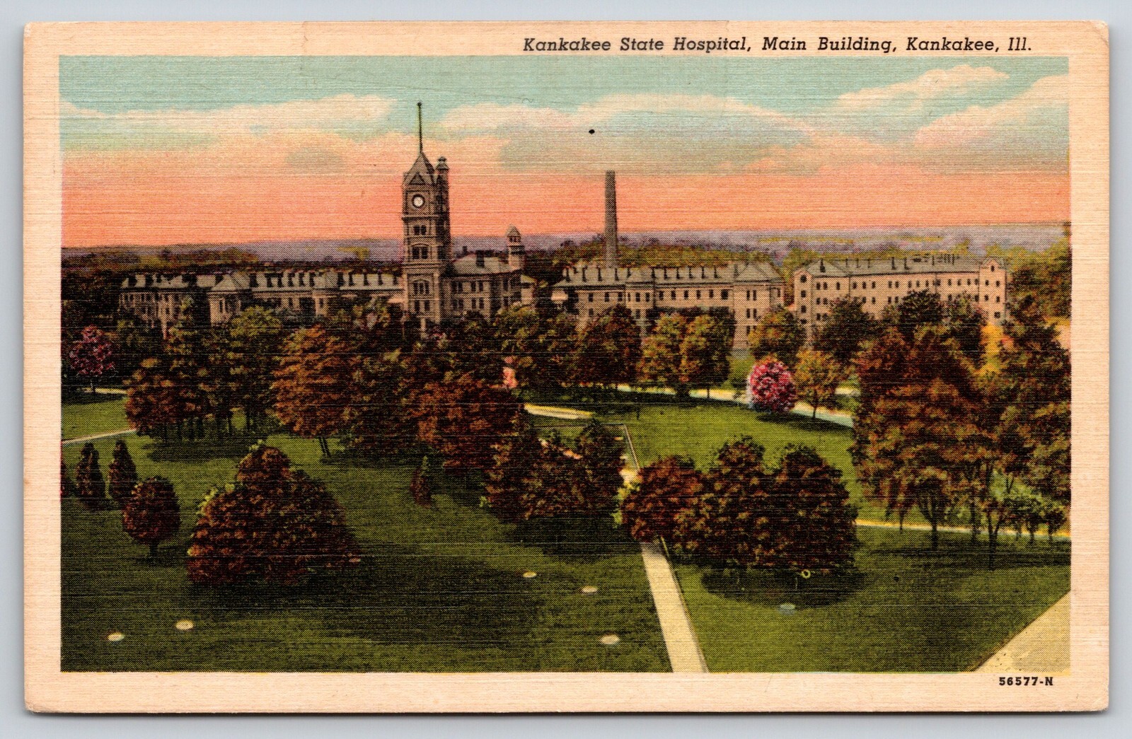 Kankakee Illinois~State Hospital~Main Bldg~Clock Tower~1940s Linen Postcard