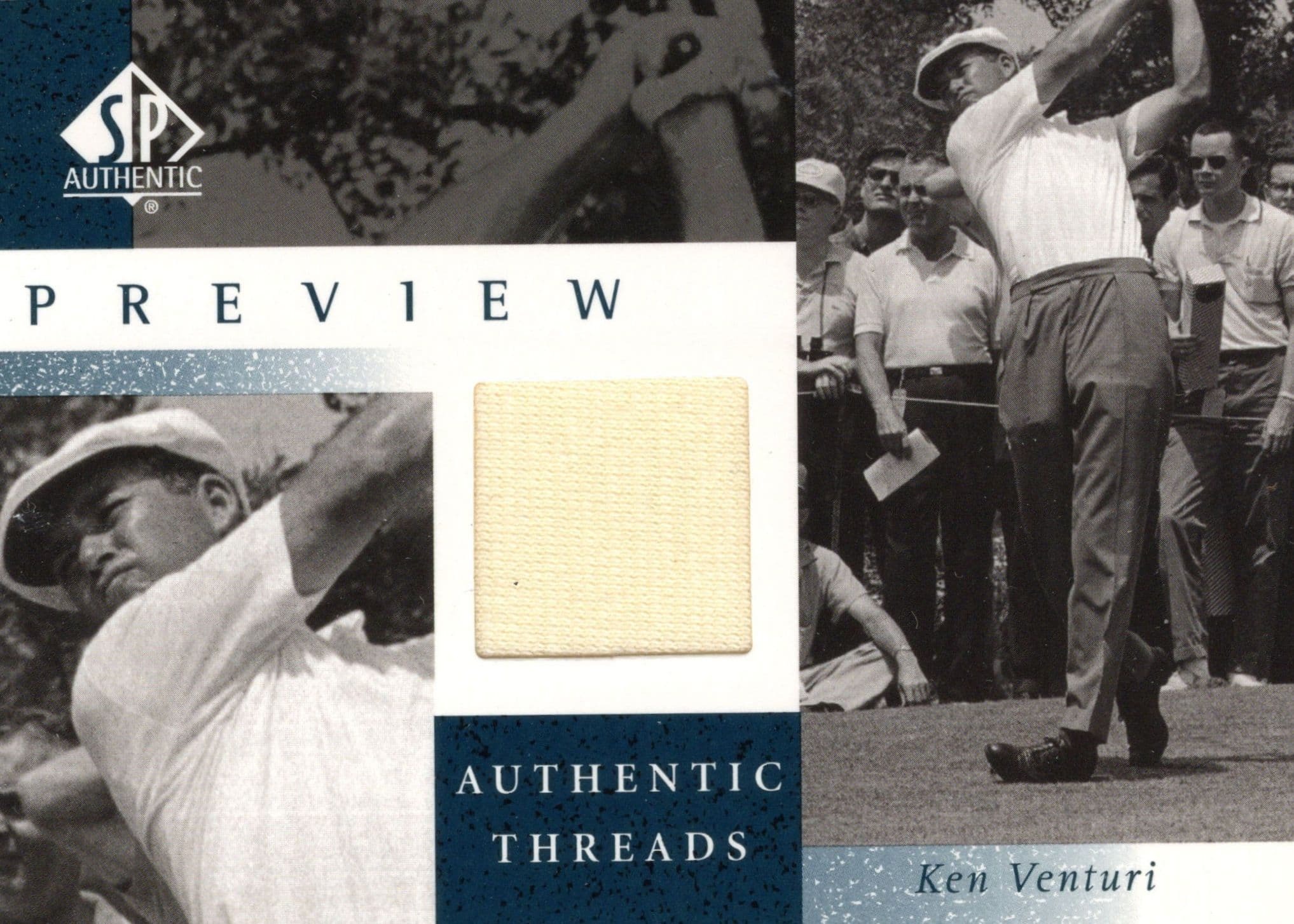 GC6 This is a rare limited edition collectors approx 3.5" x 2.5" specialist souvenir featuring an original piece of an actual shirt that was personally worn by historic golfer Ken Venturi and is fully authenticated on the reverse. The shirt itself has been mounted on the front of the card next to the photo of Ken Venturi in action on the golf course (see image 1) with beautiful metallic gold logo to lower right corner (the golfers name is embossed in metallic gold too) and on reverse it reads...