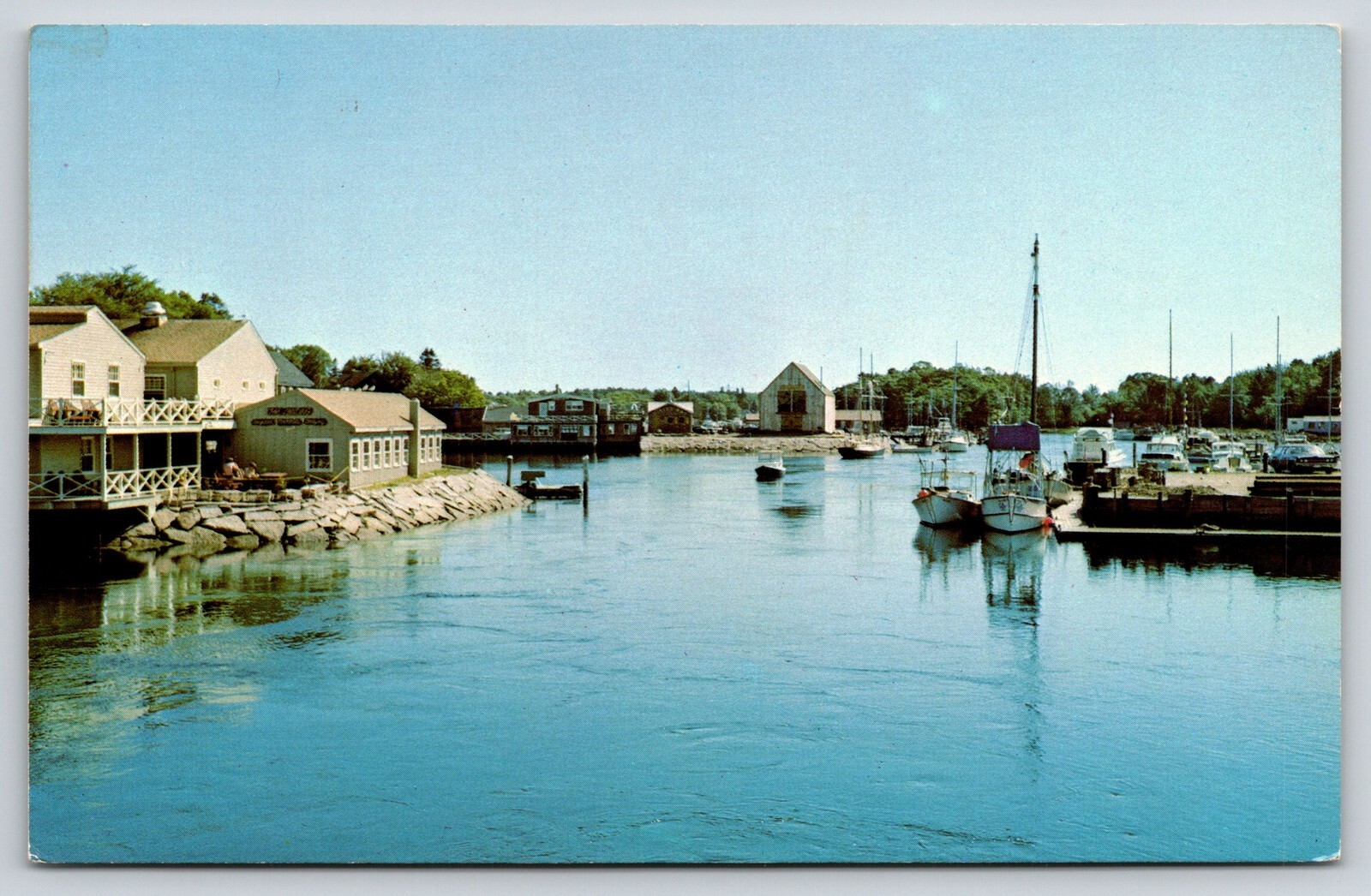 Kennebunkport Maine~River View~Houses~Dock~Sailboat~Reflection~1950s Postcard