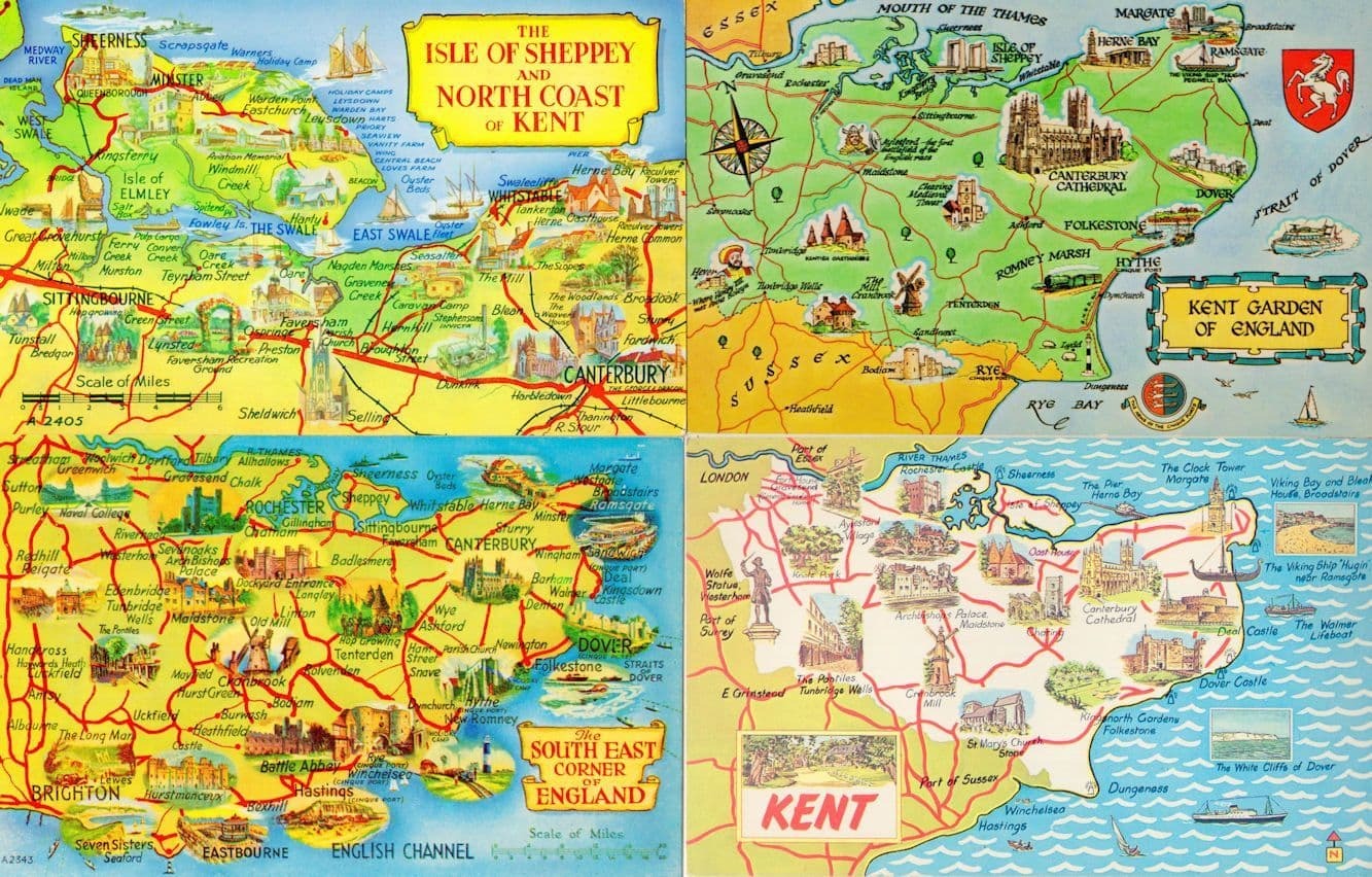 Kent 4x 1970s Cartoon Vintage Map Postcard s