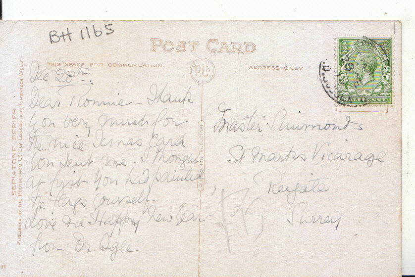 Mo's Postcards Postcard Description: Kent Postcard - Tunbridge Wells - Lake On The Common Genealogy Information: Used - 1915 or 1916 - Master Ronnie Simmonds - St marks Vicarage - Reigate - Surrey Defects: Small but heavy crease to top righthand corner and a couple of slight creases at bottom edge Postage & Payment: For U.K residents the quoted P & P fee is for any number of postcards purchased at one time. Happy to quote for non UK residents. For multiple purchases please wait for an invoice Listing and template services provided by inkFrog