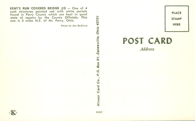 Kent's Run Covered Bridge. Perry County, Ohio. Standard sized chrome card. Excellent condition.