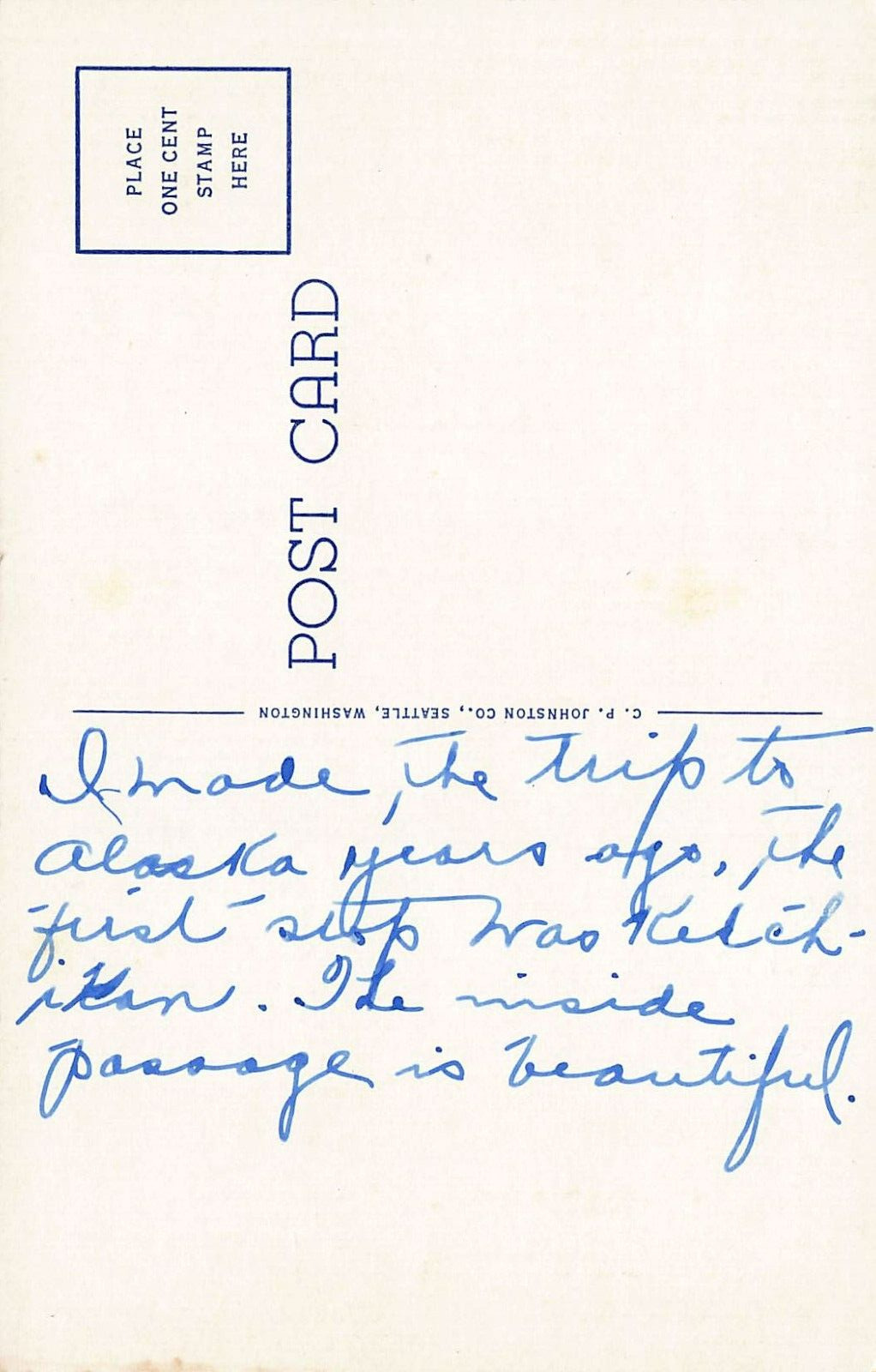 - KETCHIKAN Alaska Down Tongass Narrows Postcard- Publisher: C. P. Johnston Co- Type: Linen- Circulated: No, words on back- Condition: See Images -- Please review images for condition. Vintage postcards often have corner bumps and edge wear.- SKU: B909Your postcard will be sent using Hip standard envelope shipping.Hip standard envelope provides tracking by Hip only > not the USPS.Your post office will not be able to provide you with any information. Standard envelope shipping tracking is for Hip, not the post office.Contact us should there be an issue.Should you need insurance, make a request prior to paying so that you can be invoiced for the insurance. Insured postcards must then be sent first class mail. We also offer combined shipping.
