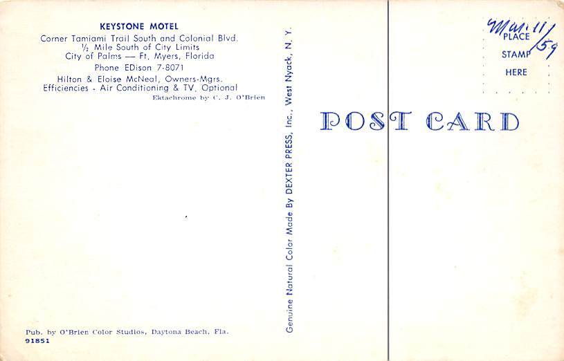 Keystone Motel Fort Myers FL Postcard - Unused Grade: 4 Size: R - Regular size: Approx 3 1/2 X 5 1/2 inch (9 cm X 14 cm) Grading Scale: Grade 1 = Perfect corners Grade 2 = Very Minimal corner wear, no creases ... Read More