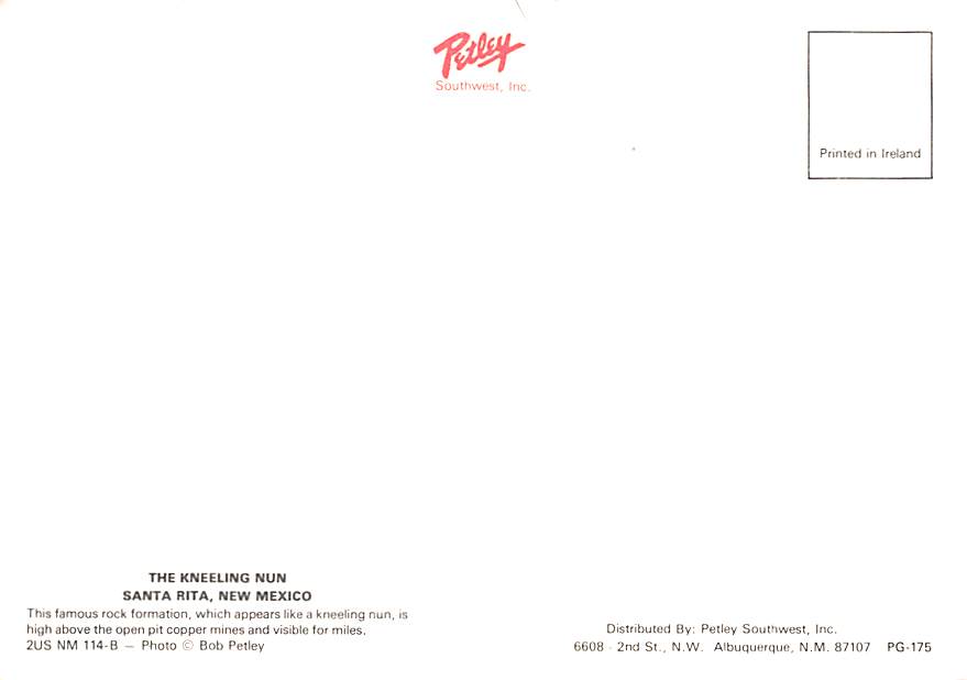 Kneeling Nun - Santa Rita, New Mexico Grade: 1 Category: Continental Size Postcard, Approx 4 in x 6 in (10 cm x 15.25 cm) Product Size: Continental size: 4X6 inches (10.5 cm x 15 cm) Grading Scale: Grade 1 = P ... Read More